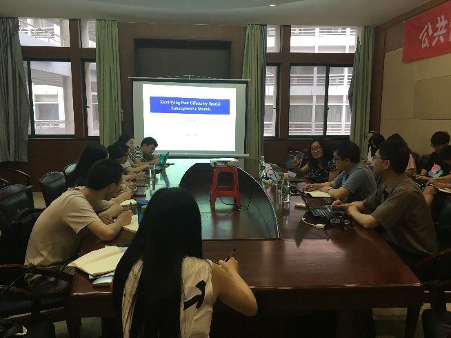 2018年6月14日晚18:20-19:50,我校文澜讲座教授林徐博士在文泉楼北303会议室举行了题为“空间计量模型的基本框架以及在社交网络近邻效应的应用“的学术讲座。公共管理学院院长丁士军教授、副院长邓汉慧教授、劳动和社会保障系熊卫副教授、黄宏伟老师及相关专业的硕士生参加了本次讲座交流。