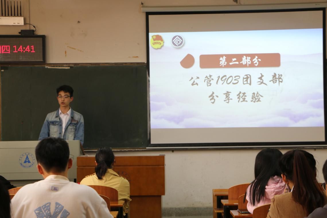 会议伊始,公管1903班长及团支书就如何建设优秀团支部进行经验分享。公管1903班长黄童认为,建设班委团队和班级制度是建设优秀团支部的关键。在建设班委团队方面,他提出班委应增进与班团成员间的交流,可定期开展班级会议以集思广益;在建设班级制度方面,他提出采用课前签到考勤与个人积分制度两种方法规范班级纪律。随后,他分享了自己作为班长的个人心得,建议各位班长与班委合理分工、相互配合,合力激发出同学们的创造性。接下来,团支书李昕彤分享了举办班级团日活动及组织比赛的各种细节。他提到,班委应该发挥主干作用,尽可能拓展团日活动的形式以增加其趣味性;而组织比赛时班委应团结起同学,切忌以权威压人而挫伤同学的积极性。